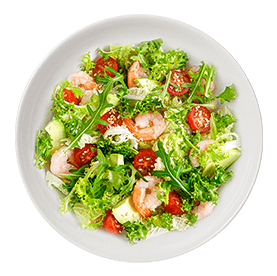 Salade verte, tomates, avocat, crevettes, maïs, sauce cocktail + Pain maison offert.